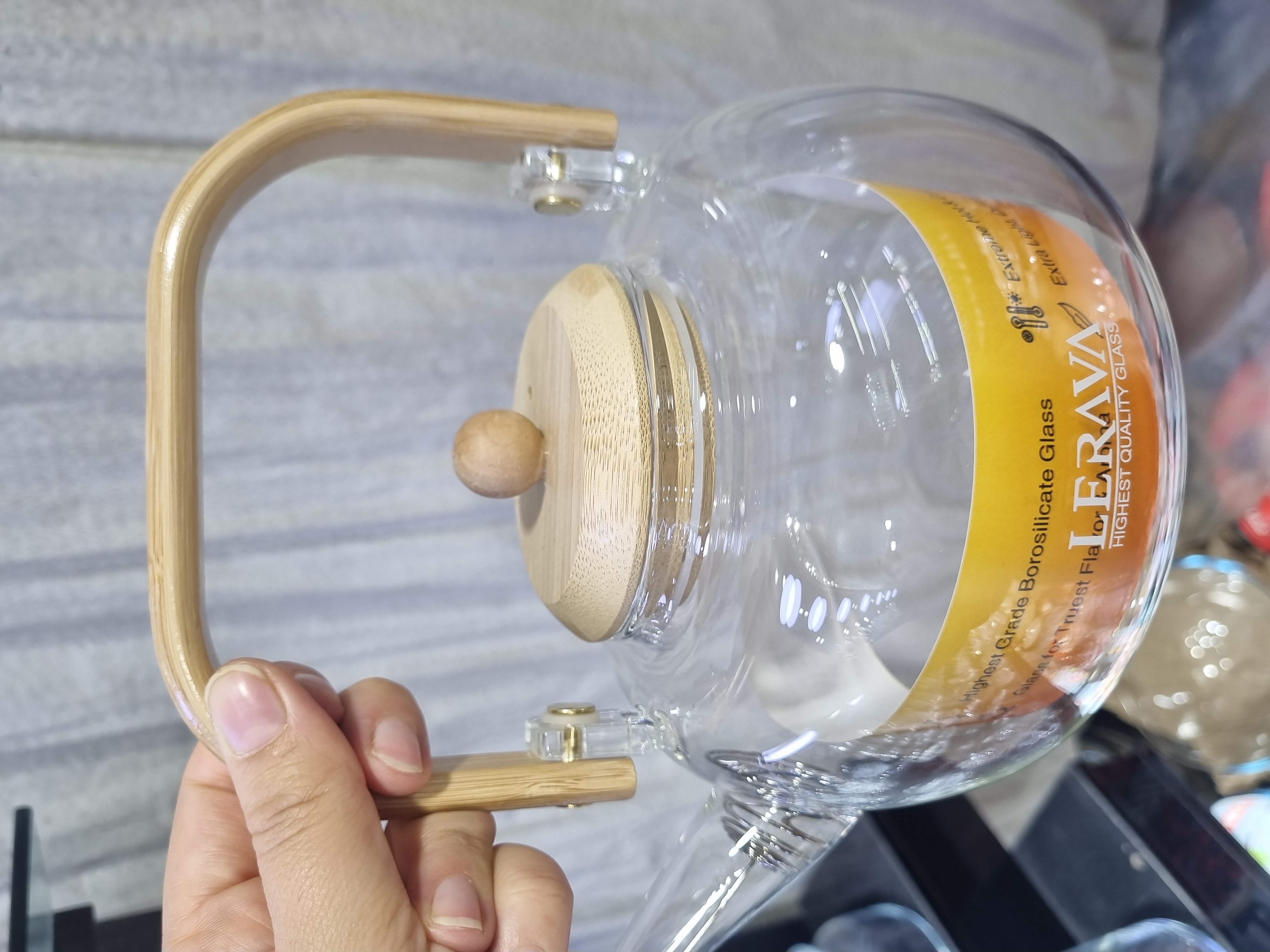 این قوری پیرکس با صافی شیشه ای، دسته ای بامبو و از بالا دارد. روی شعله مستقیم می توانید از این محصول استفاده کنید و حجم مناسبی برای استفاده در مهمانی ها دارد.